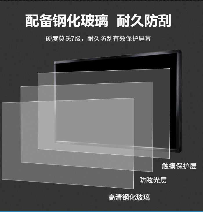 (4)整機(jī)采用4mm厚鋼化玻璃,防爆,防劃,屏幕表面可承受550g鋼球在1.5米高度自由下落撞擊。