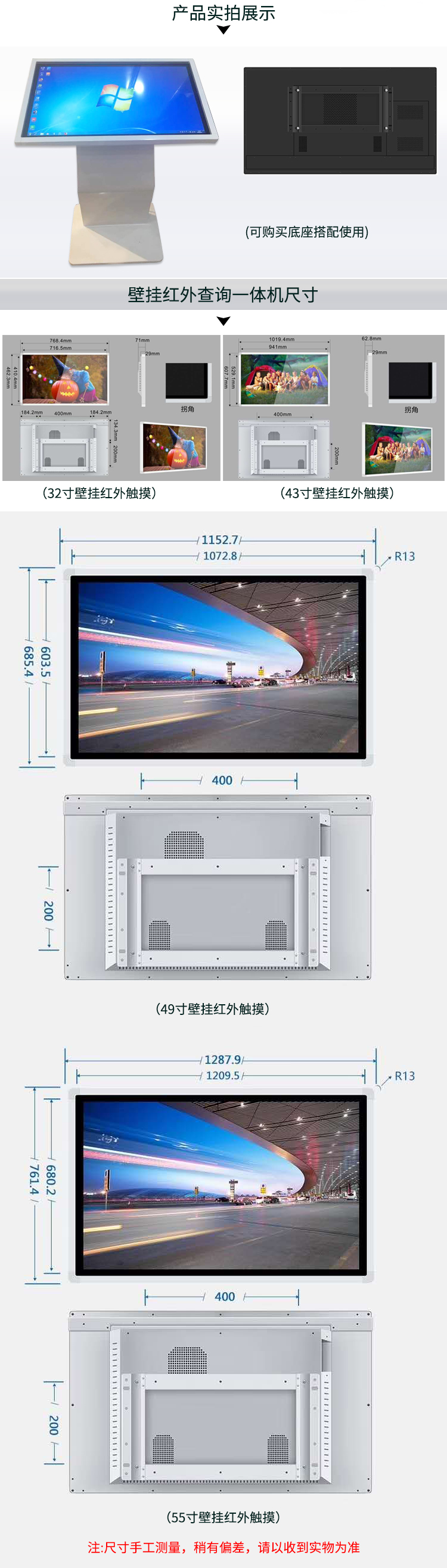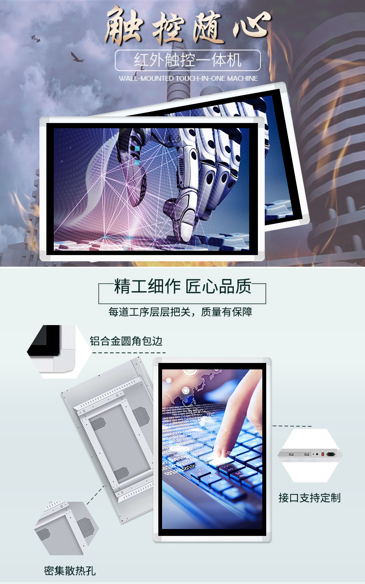 鋁合金邊框,鈑金后殼,標配壁掛架,可選配獨立設計的底座 |