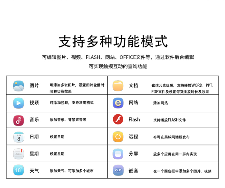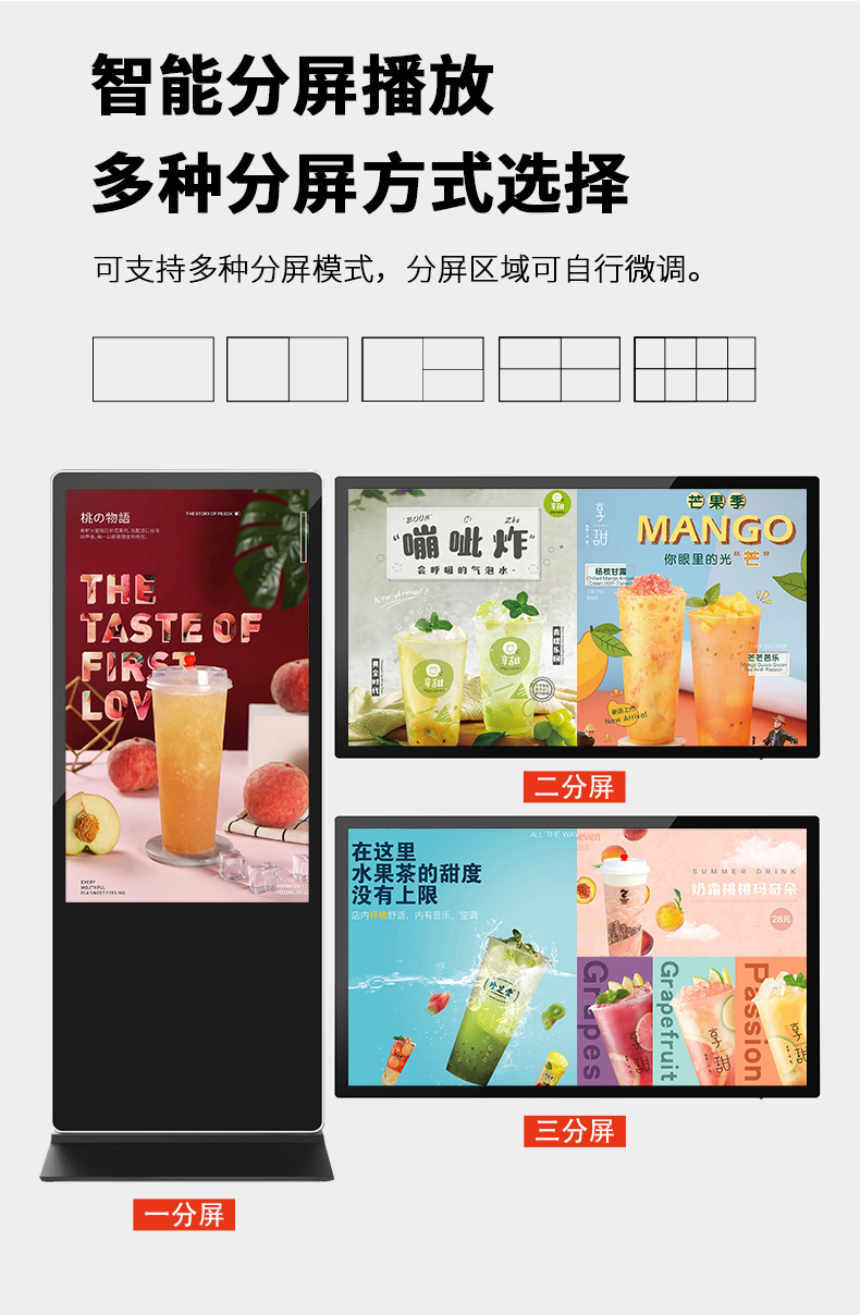 支持1個(gè)視頻區(qū)域、5個(gè)圖文區(qū)域、5條滾動(dòng)字幕、1個(gè)LOGO區(qū)域、1組日期時(shí)間星期區(qū)域、1個(gè)天氣預(yù)報(bào)區(qū)域。實(shí)現(xiàn)自由分屏功能,不同區(qū)域顯示不同內(nèi)容 |