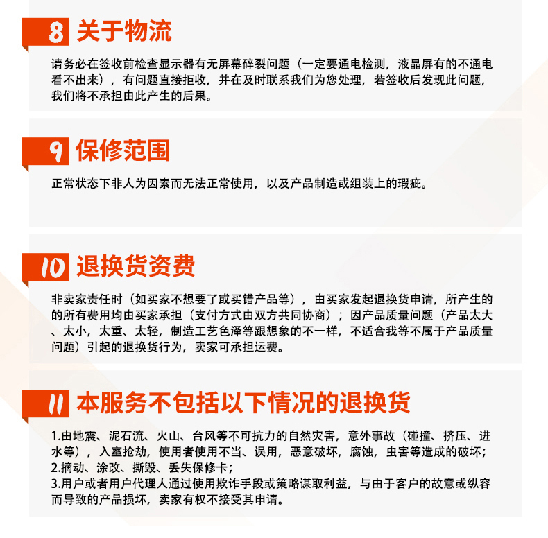 1、七天包退:自產(chǎn)品驗(yàn)收日起七天內(nèi),因產(chǎn)品自身存在質(zhì)量問題,用戶可以選擇修理,換貨或者退貨。