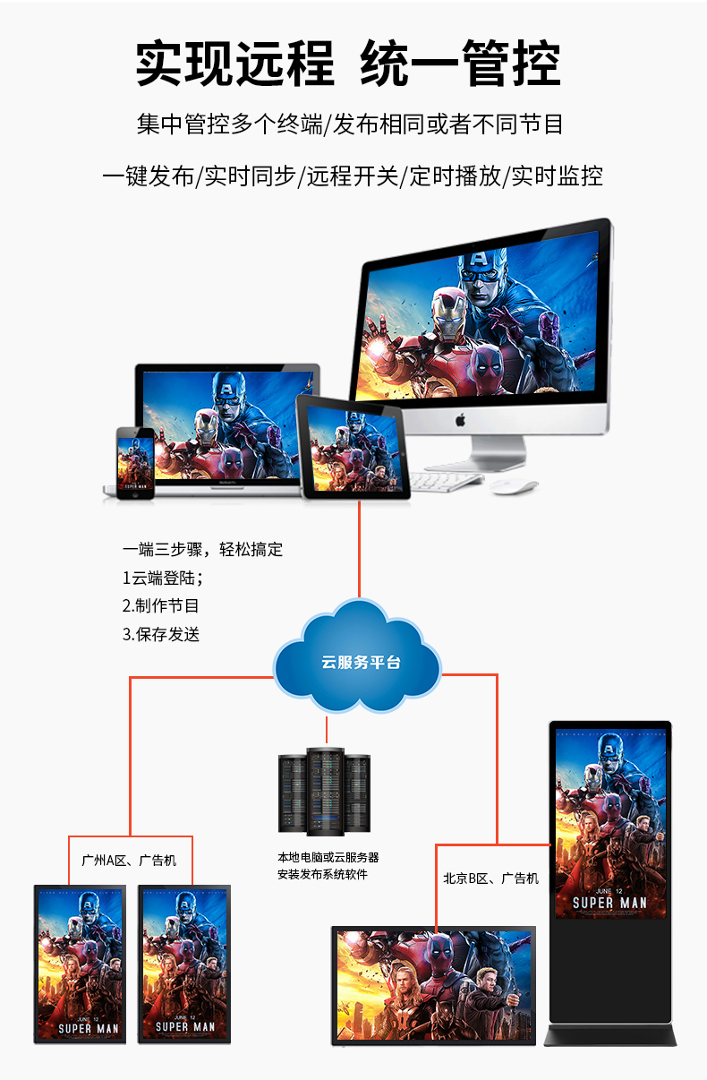 包括播放器注冊信息,IP信息、分組、分區(qū)域設(shè)置,系統(tǒng)能對播放終端進(jìn)行包括電源管理、IP管理、自動(dòng)校時(shí)、遠(yuǎn)程升級(jí)、定時(shí)開關(guān)機(jī)等管理,播放器可斷網(wǎng)、來電自動(dòng)恢復(fù)播放。 |